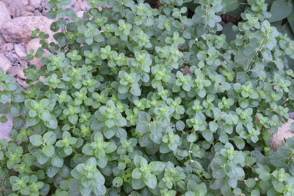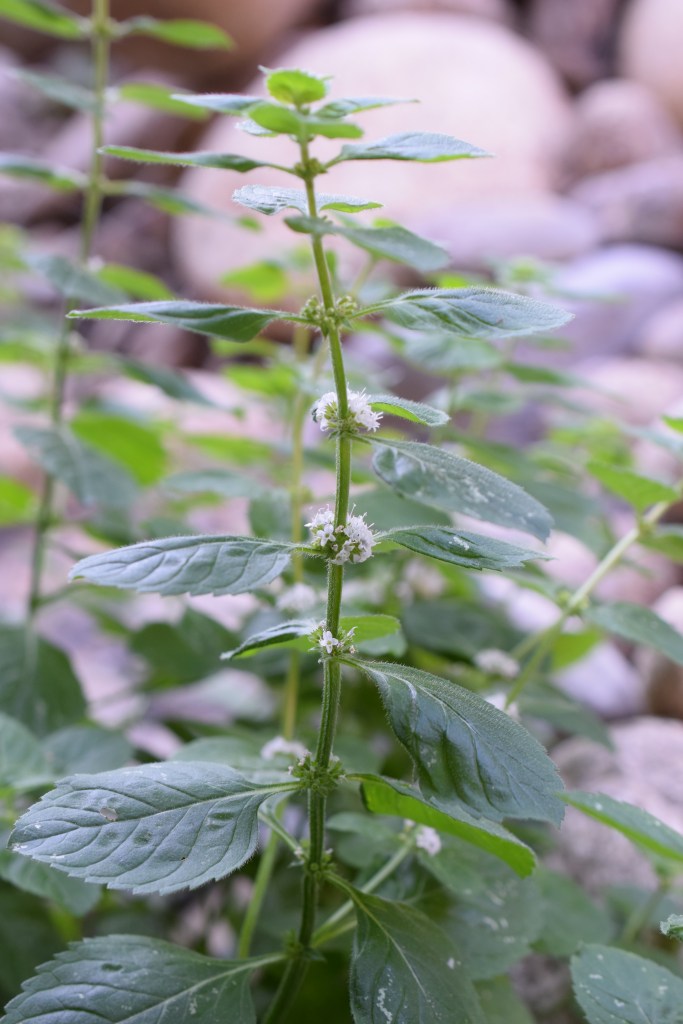 La menthe des champs, Mentha arvensis, Lamiaceae, apprécie les lieux humides. Les feuilles sont pétiolées, les supérieures presque aussi grandes que les autres. La tige se termine par un faisceau de feuilles.